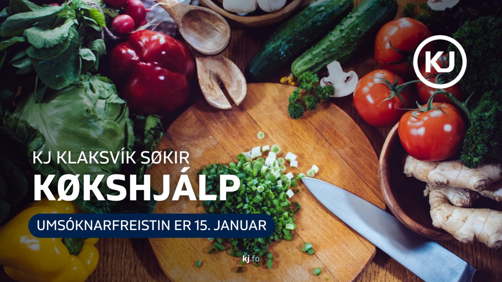 KJ søkir eftir einum álítandi og arbeiðssomum køkshjálpara (m/k), sum kann átaka sær dagligau ábyrgdina av arbeiðinum í køkinum hjá KJ Klaksvík. Rætti umsøkjarin er hevur hugflog og royndir innan matgerð, er samstarvssinnaður og vil vera við til at tryggja eitt gott og reint arbeiðsumhvørvi. Talan er um eitt tímalønt starv á áleið 5 tímar um dagin. Arbeiðstíðin er frá kl. 08:30 – 13:30